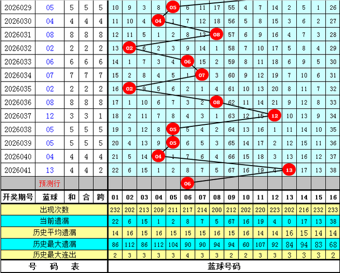蓝球走势分析:上周四第26039期蓝球开出号码05,最近十周星期四蓝球号码大小比为3:7,奇偶比为5:5,012路比为1:6:3。本期蓝球重点关注偶数号,看好蓝球06、08。